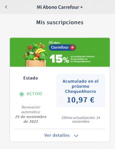 El caso es que la última novedad viene con un modelo de suscripción digital que promete ahorro pero a priori a muchos puede darles para atrás, resumo el concepto del Abono Carrefour+: uno se suscribe por 5,99€ al mes y acumula en su Chequeahorro el 15% del importe gastado en los productos frescos de la cesta de la compra, sea física u online.